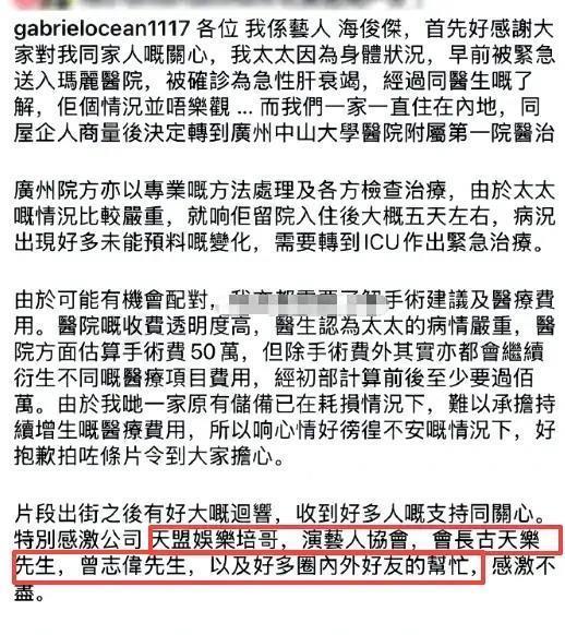 这里要特别夸夸古天乐。他一直都是这样,只要有人需要帮助,他从不犹豫。曾志伟这次也特别讲义气,关键时刻帮了大忙。海俊杰后来专门发文感谢了所有帮助他的人。钱凑够了,他立刻准备给妻子做手术。可是,命运真的太会捉弄人了。就在昨天,还没等到做手术,他的妻子就永远闭上了眼睛。就像几年前因同样疾病去世的朱媛媛一样,最终还是被病魔带走了。